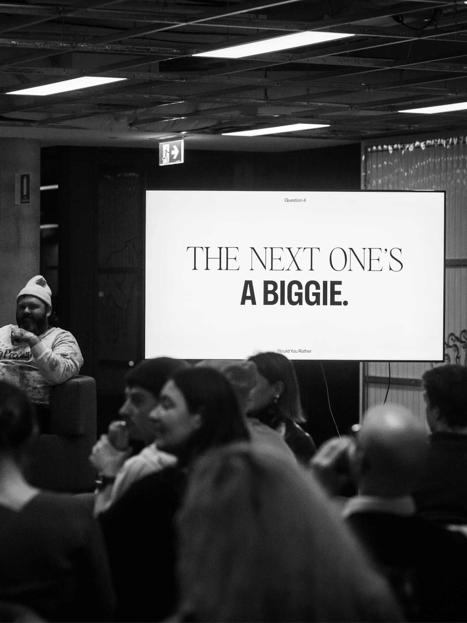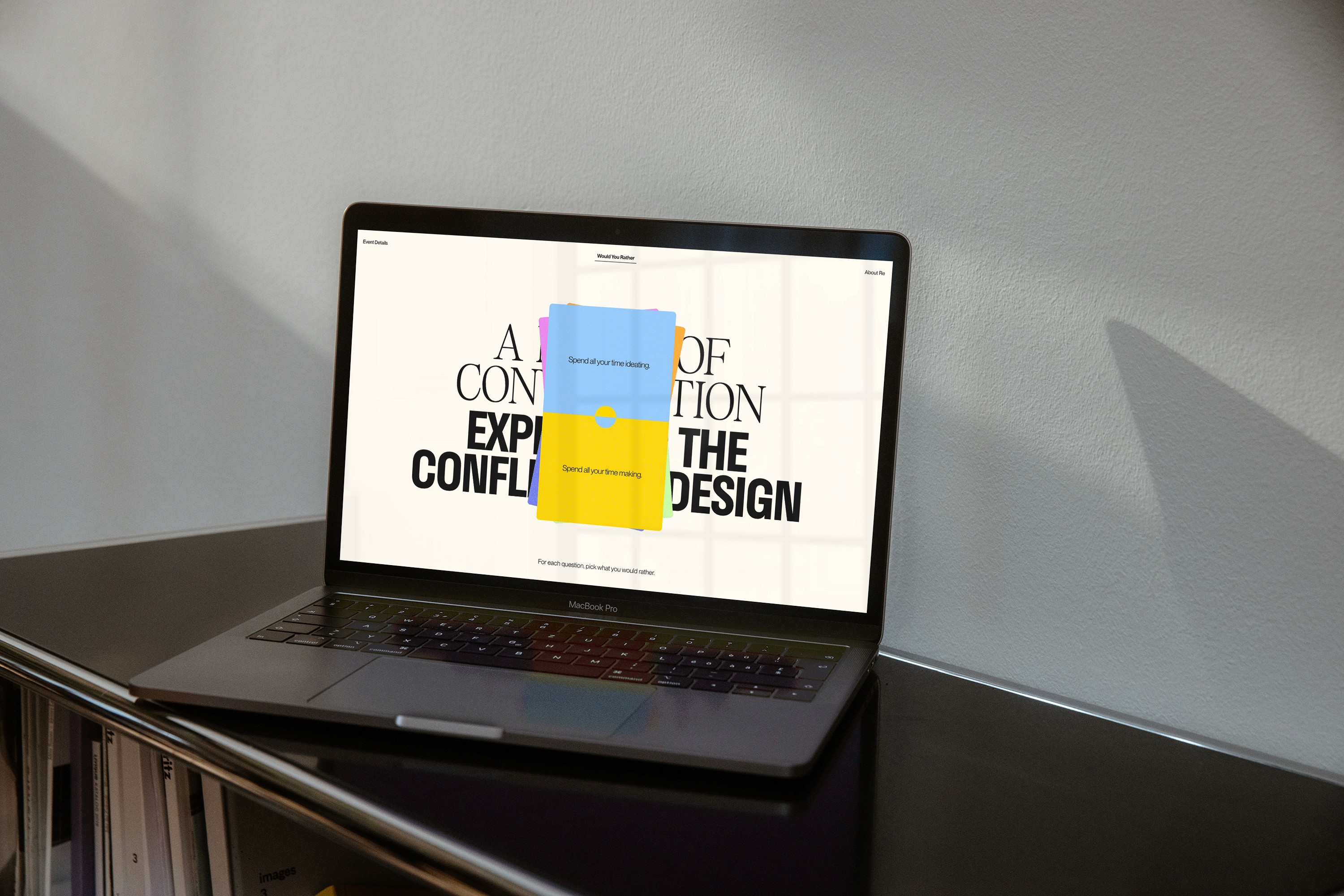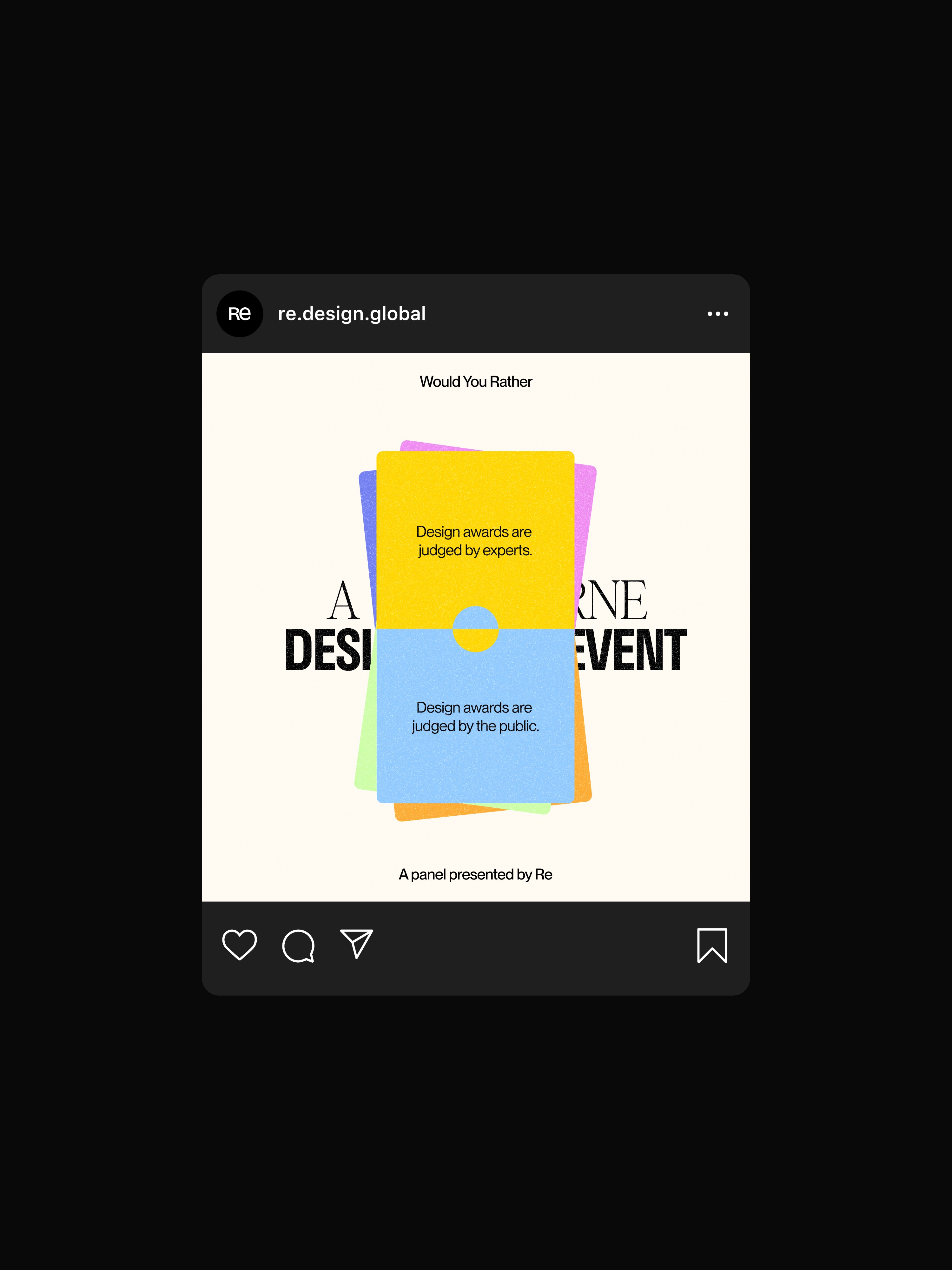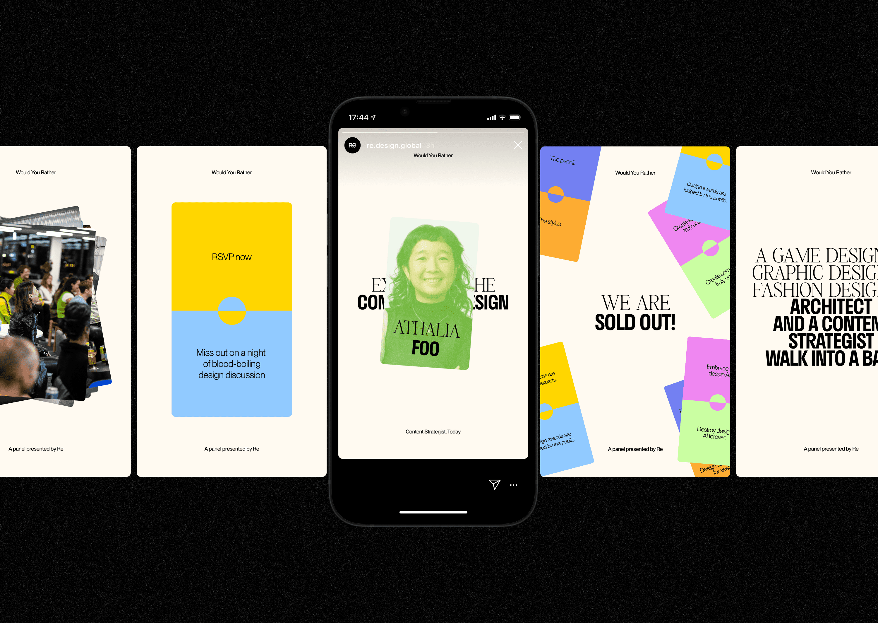 We created a microsite that guided people through twenty carefully selected questions. On completing the quiz, users could see where they sat in relation to the broader design community. We then took Would You Rather to the stage for an interactive panel discussion. Our panelists spanned multiple design specialisms from graphic to motion, fashion and game design, meaning the discussion was interesting and multifaceted, and a diverse section of the community was represented. Thanks to colour-coded voting cards, the audience was able to weigh in on every question, creating a boisterous and engaging discussion for all.