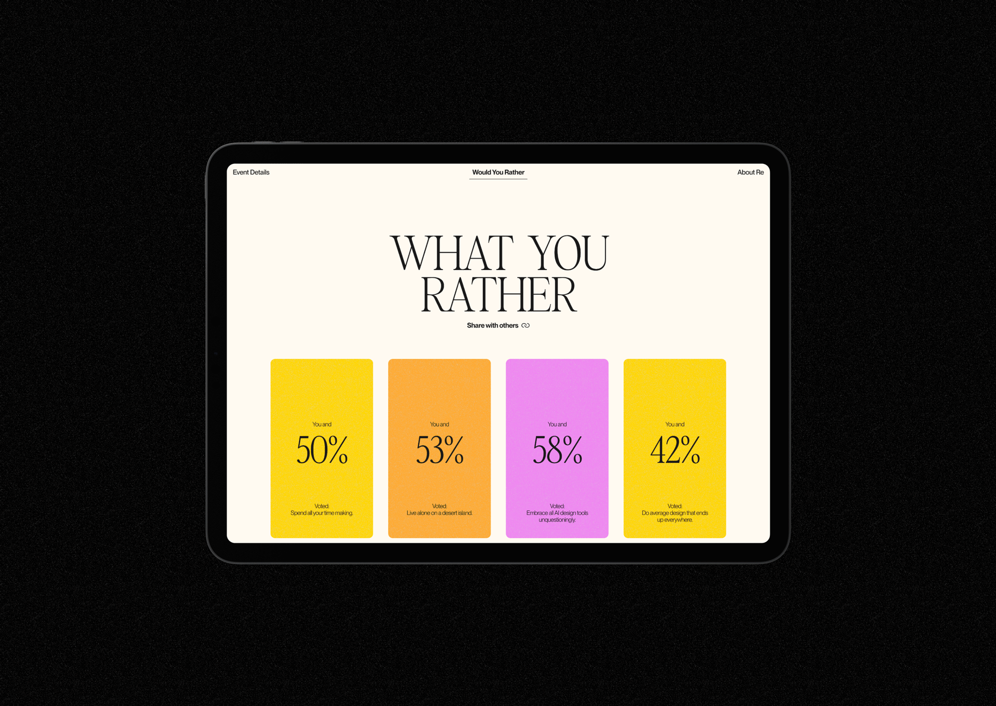 Enter Would You Rather – a simple concept that enabled us to explore some of the big issues in design in a way that was super easy for people to engage with. We co-opted the well known game and formulated questions that forced designers to show where they sit on some of the topics that are dominating our industry right now. Questions like: Would you rather embrace all AI design tools unquestioningly, or destroy them forever? And: Would you rather design awards were judged by experts, or by the public?